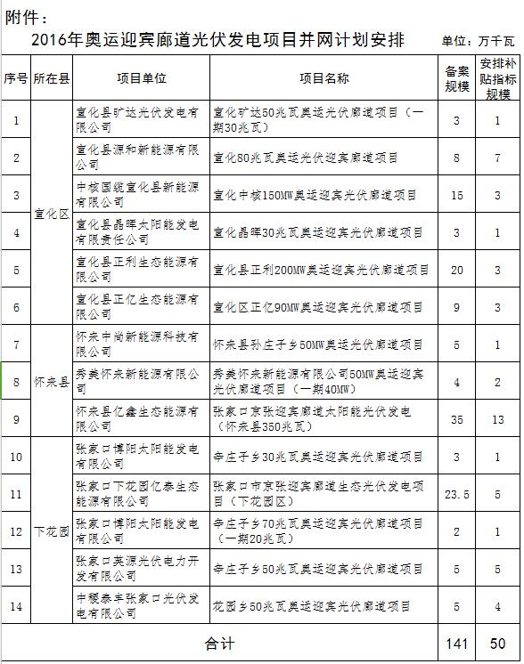 河北省2016年奧運迎賓廊道光伏發(fā)電項目并網(wǎng)計劃安排情況公示 京張奧運迎賓廊道光伏發(fā)電項目,規(guī)劃總規(guī)模155.5萬千瓦,是2022年冬奧會重點工程之一。今年,國家先期下達并網(wǎng)計劃50萬千瓦。根據(jù)《關(guān)于申報2016年奧運迎賓廊道光伏發(fā)電項目的通知》(冀發(fā)改能源〔2016〕1038號)要求,經(jīng)張家口市發(fā)改委申報,并按照國家能源局要求,委托水電水利規(guī)劃設(shè)計總院依據(jù)企業(yè)編制的建設(shè)方案,圍繞技術(shù)先進性標準、生態(tài)環(huán)保標準、景觀效果標準以及項目競價情況,進行綜合評價、排序的基礎(chǔ)上,經(jīng)研究并報國家能源局同意,現(xiàn)對2016年奧運迎賓廊道光伏發(fā)電項目并網(wǎng)計劃安排有關(guān)情況,予以公示。 本次計劃安排所有項目均為已列入廊道規(guī)劃總規(guī)模,且已具備開工建設(shè)條件的項目;按《河北省普通光伏電站項目競爭性配置辦法》要求,經(jīng)項目業(yè)主申報、專家評審,本計劃所安排的項目上網(wǎng)電價按在項目投產(chǎn)時當(dāng)?shù)厣暇W(wǎng)標桿電價基礎(chǔ)上降低0.03元/千瓦時執(zhí)行。 公示時間為2016年10月13日至10月17日。期間,如有異議,可如實向河北省能源局反映。 聯(lián)系電話:0311—88600512 附件:2016年奧運迎賓廊道光伏發(fā)電項目并網(wǎng)計劃安排 河北省能源局 2016年10月13日